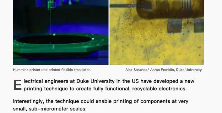【环球网科技综合报道】10月21日消息,据外媒报道,美国杜克大学的电气工程师取得重大突破,成功开发出一种全新的印刷技术,该技术能够制造出功能完备且可回收的电子产品,为电子行业可持续发展带来新可能。